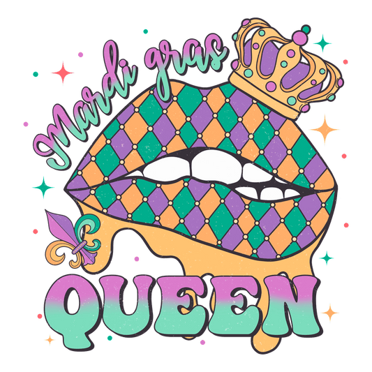 Colorful Mardi Gras-themed design featuring a vibrant lip graphic adorned with a crown, celebrating the spirit of festivities.DTF Transfers