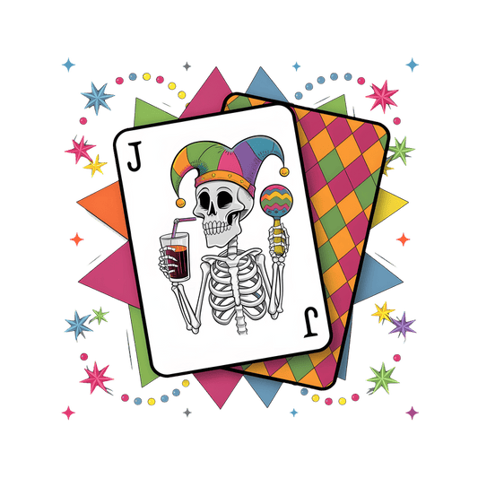 Regular price From £0.75 GBPRegular priceUnit price / per£2.40 GBPSale price From £0.75 GBPA whimsical playing card design featuring a jester skeleton holding a colorful drink and maraca, surrounded by vibrant stars and shapes.DTF Transfers