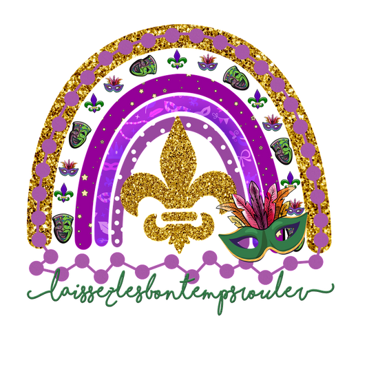 A vibrant Mardi Gras-themed design featuring colorful masks, a gold and purple rainbow, and the phrase "Laissez les bons temps rouler" in green.DTF Transfers