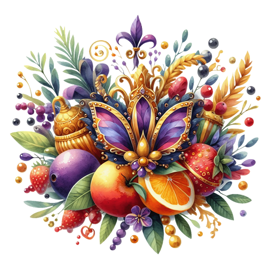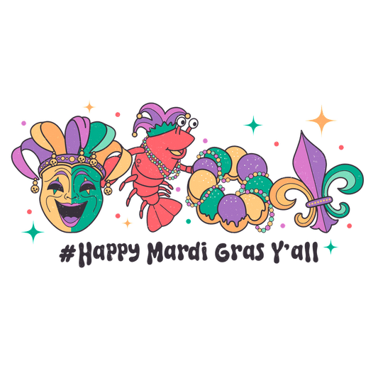 Celebrate Mardi Gras with this vibrant design featuring festive colors, a cheerful vibe, and decorative symbols of the celebration!DTF Transfers