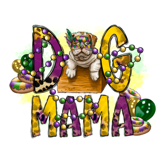 A festive and colorful design featuring a masked bulldog with beads and decorations, celebrating the fun spirit of "Dog Mama."DTF Transfers
