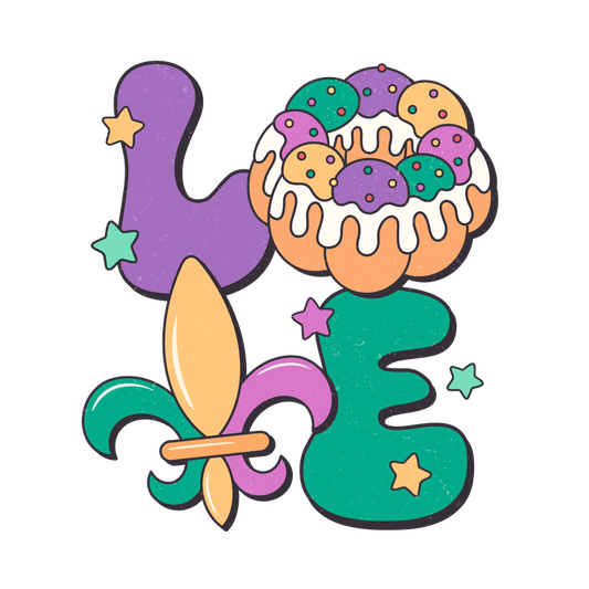 Colorful and whimsical design featuring "LOVE" with a donut topped with frosting and sprinkles, accented by stars and a fleur-de-lis.DTF Transfers