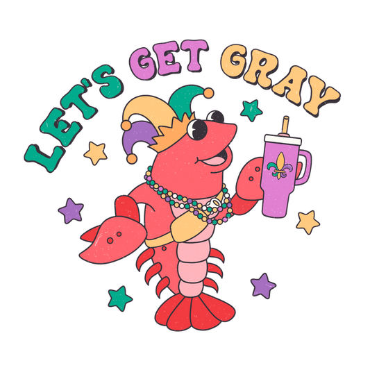 Regular price From £0.75 GBPRegular priceUnit price / per£2.40 GBPSale price From £0.75 GBPA festive lobster wearing a jester hat, beads, and holding a drink, celebrates with the phrase "Let's Get Gray."DTF Transfers