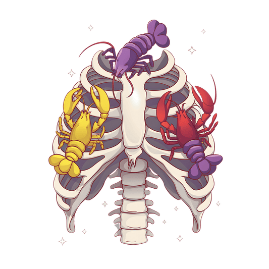 A whimsical illustration featuring colorful lobsters perched on a stylized human ribcage, blending marine life with anatomical design.DTF Transfers