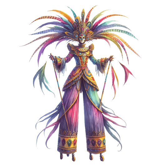 A vibrant, colorful character adorned with a stunning feathered headdress and intricate costume featuring flowing fabrics and sparkling embellishments.DTF Transfers