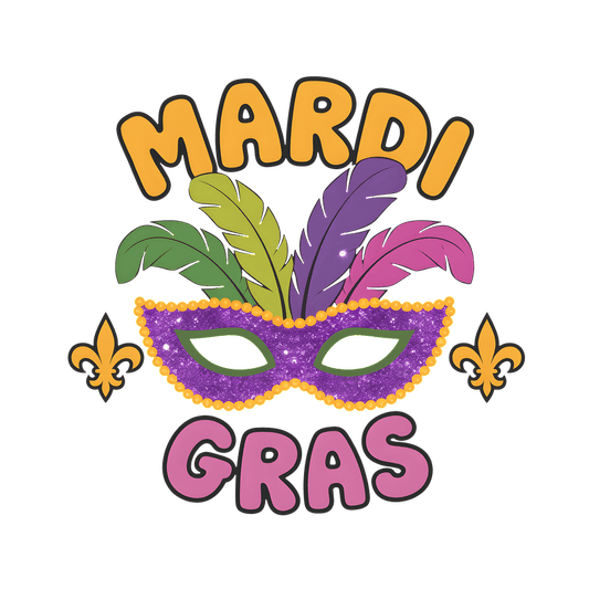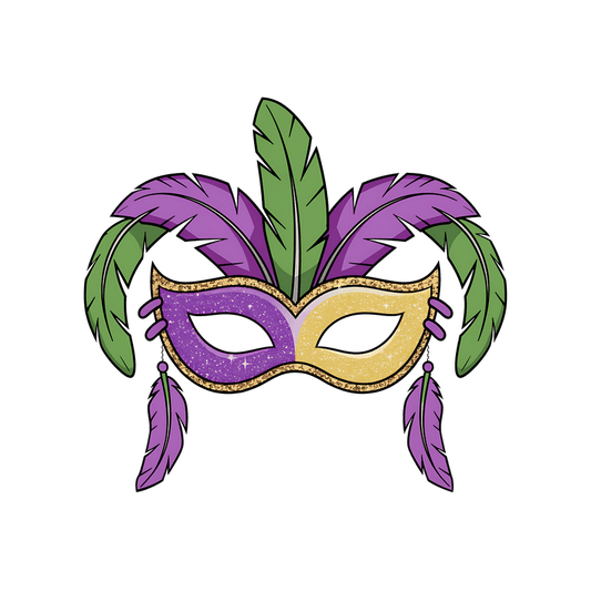 Celebrate Mardi Gras with this vibrant mask design, featuring colorful feathers and festive text perfect for the occasion!DTF Transfers