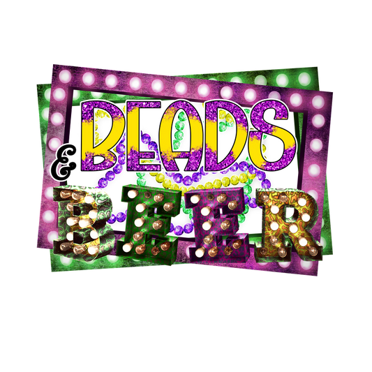 A vibrant and festive design featuring the words "Beads & Beer," accented with colorful beads and sparkling light bulbs.DTF Transfers