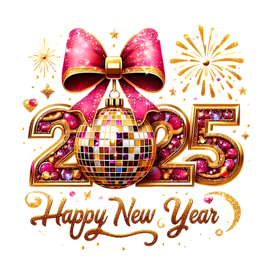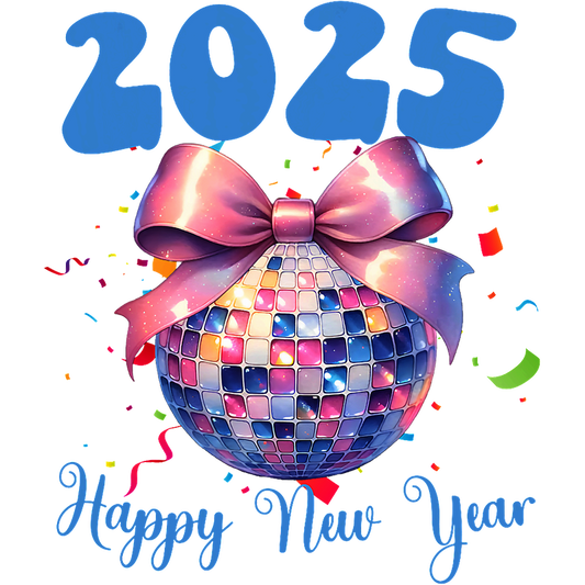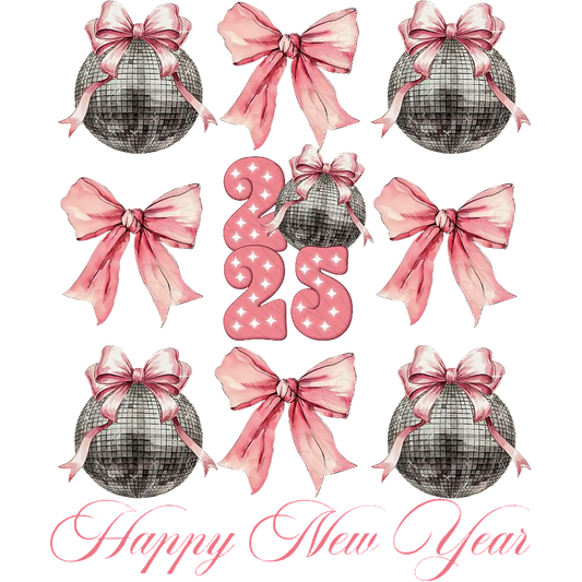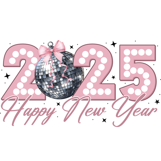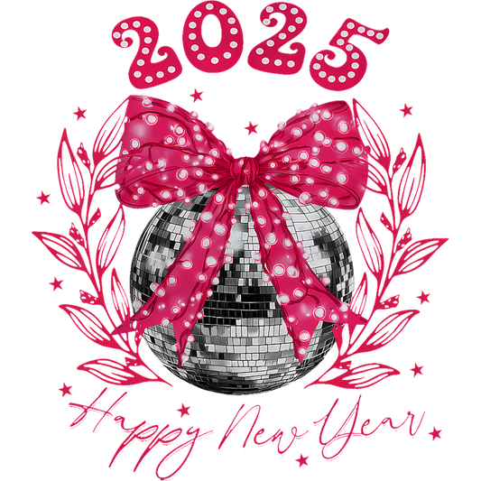 Celebrate the New Year with this sparkling 2025 design featuring a disco ball and festive pink bow! Happy New Year!DTF Transfers