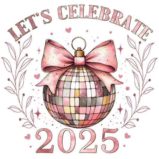 Celebrate the New Year 2025 with this festive design featuring a sparkling disco ball, bright pink bow, and cheerful decorations!DTF Transfers dtf transfers dtf transfers