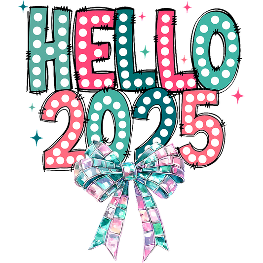 Bright and festive "Hello 2025" design adorned with colorful dots and a shimmering bow, perfect for New Year celebrations!DTF Transfers dtf prints