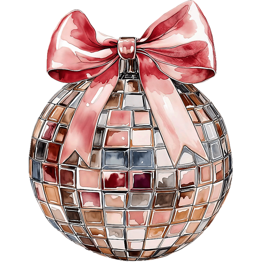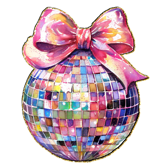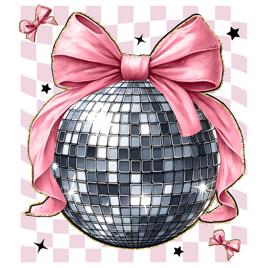 A playful illustration of a sparkling disco ball adorned with a lovely pink ribbon, perfect for adding festive flair to any setting.DTF Transfers heat press transfers dtf prints
