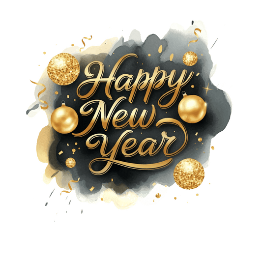 A festive Happy New Year design featuring elegant gold lettering, sparkling ornaments, and a vibrant black and gold watercolor background.DTF Transfers