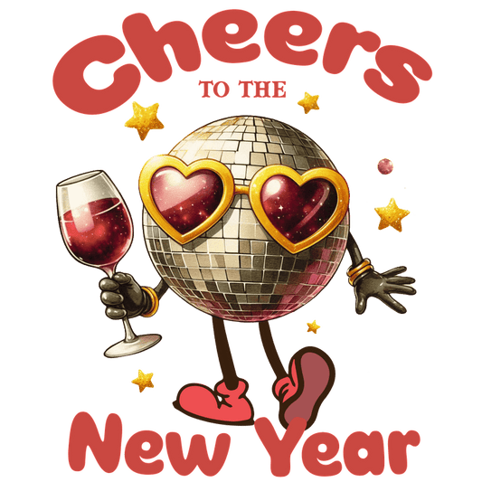 Celebrate the New Year with this cheerful disco ball character, complete with heart-shaped sunglasses and a festive drink!DTF Transfers