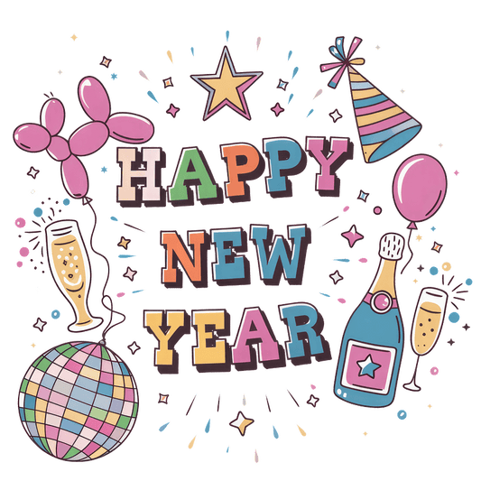 Celebrate the occasion with this festive "Happy New Year" design featuring colorful balloons, a disco ball, and sparkling drinks!DTF Transfers