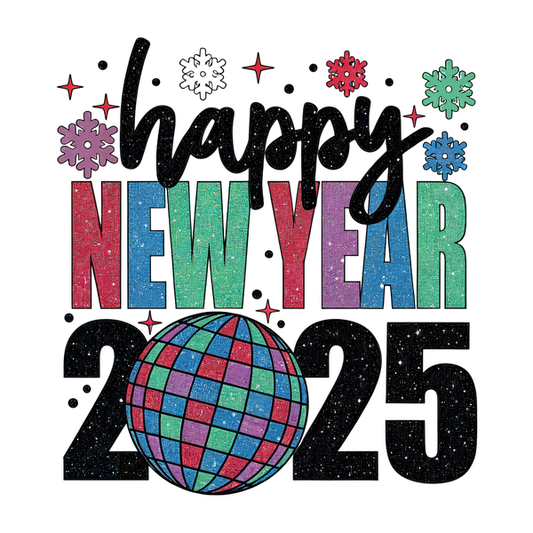 Celebrate the arrival of 2025 with this colorful "Happy New Year" design featuring a sparkling disco ball and festive snowflakes!DTF Transfers heat press transfers