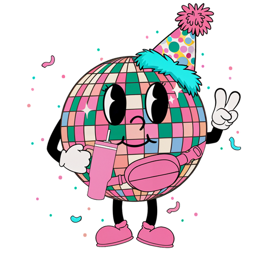 Regular price From £0.75 GBPRegular priceUnit price / per£2.40 GBPSale price From £0.75 GBPA cheerful cartoon disco ball character wearing a party hat, holding a drink, and striking a peace sign for festive fun!DTF Transfersdtf regular iron