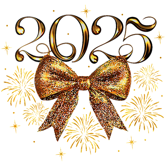 Celebrate the New Year 2025 with a sparkling golden bow and festive fireworks, perfect for any celebration!DTF Transfers dtf transfersdtf regular iron