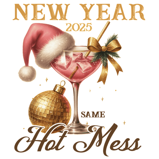 Celebrate New Year's 2025 with a playful design featuring a festive cocktail, Santa hat, and a shimmering disco ball!DTF Transfers