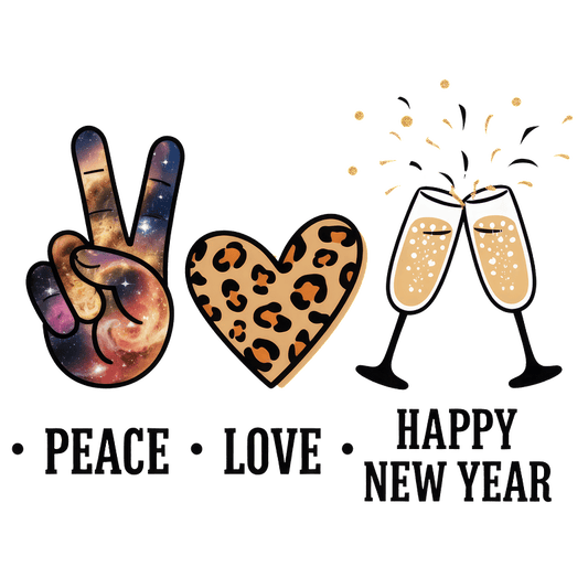 Celebrate the new year with peace, love, and festive bubbly in a vibrant design featuring a galaxy peace sign and leopard heart!DTF Transfers