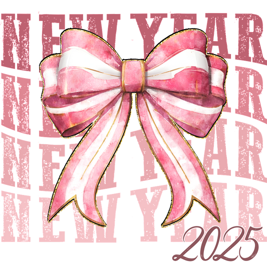 Celebrate the New Year with this vibrant pink and white watercolor bow design, featuring "New Year 2025" text in the background.DTF Transfers heat press transfers heat press transfers
