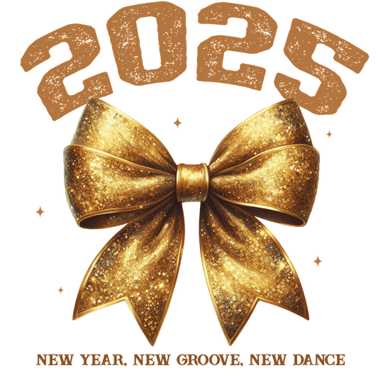 Celebrate 2025 with a shiny gold bow and sparkling text, capturing the spirit of "New Year, New Groove, New Dance!"DTF Transfers