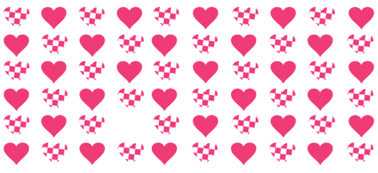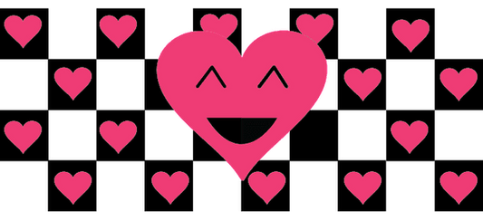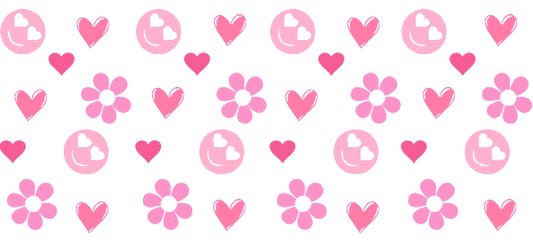 A black and white repeated pattern of hearts and flowers.UV Transfers