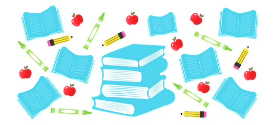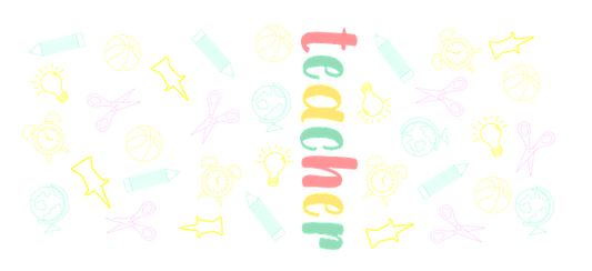 Embroidery pattern featuring the word "teacher" in blue, yellow, and green floral designs.UV Transfers