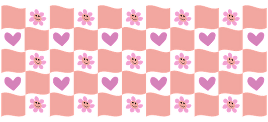 A fabric with green diamond pattern and pink hearts.UV Transfers