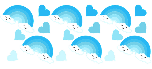A set of blue and white printed felt heart and rainbow stickers.UV Transfers