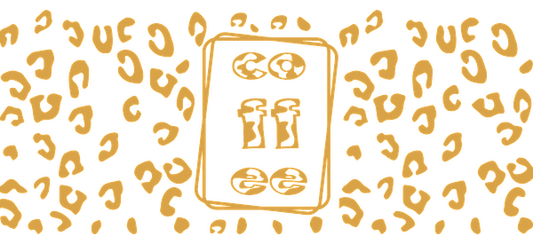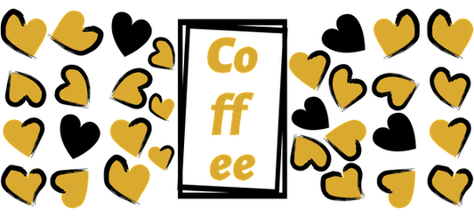 A black and yellow heart and a cup of coffee on the background.UV Transfers