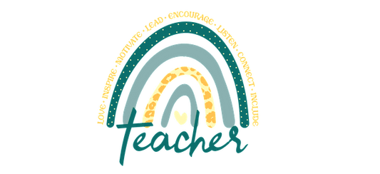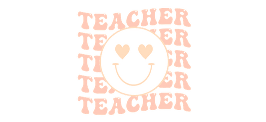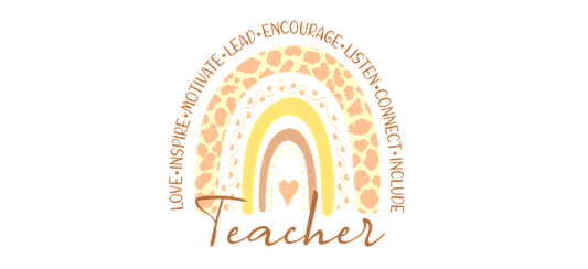 Multicolored rainbow graphic tee featuring the word "Teacher".UV Transfers