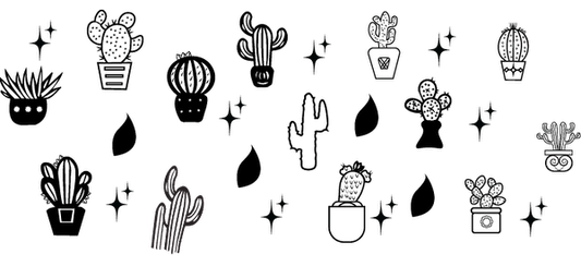 Black and white cacti in black pots arranged on a green background.UV Transfers