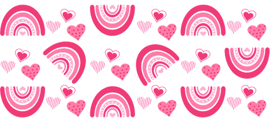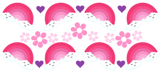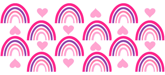Rainbow design with hearts and bows in pink and purple.UV Transfers
