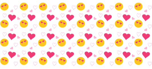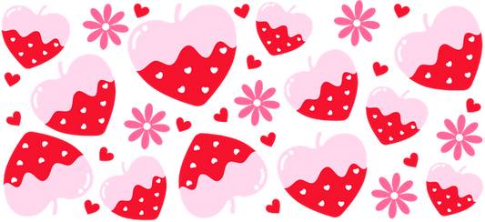 Graphic design featuring heart shapes, strawberries, and flowers.UV Transfers