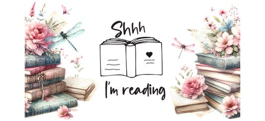 The elegant card depicts the message "shhh... I'm reading".UV Transfers