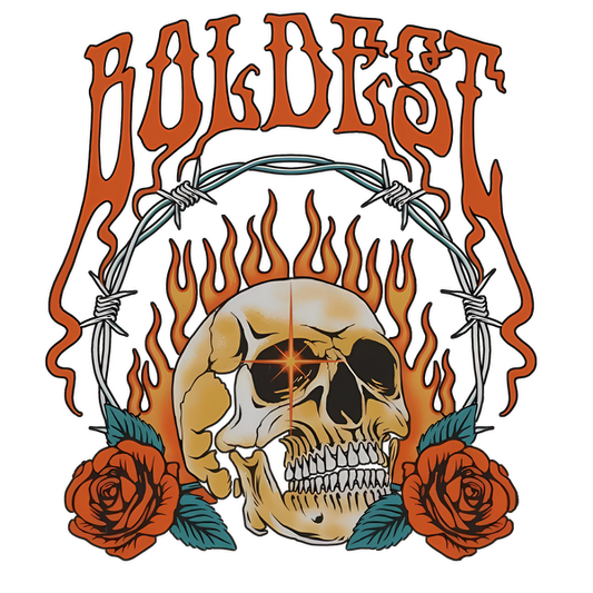A striking graphic design featuring a skull surrounded by flames and roses, with the word "BOLDEST" prominently displayed. dtf transfers