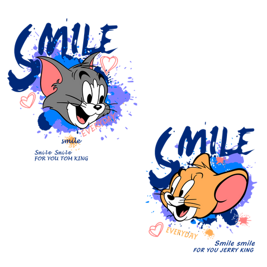 Whimsical cartoon art featuring Tom and Jerry, with playful "SMILE" text and vibrant colors, celebrating joy and friendship.