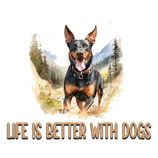 A joyful Doberman running through nature, with the phrase "Life is better with dogs" beautifully illustrated around it. dtf transfers
