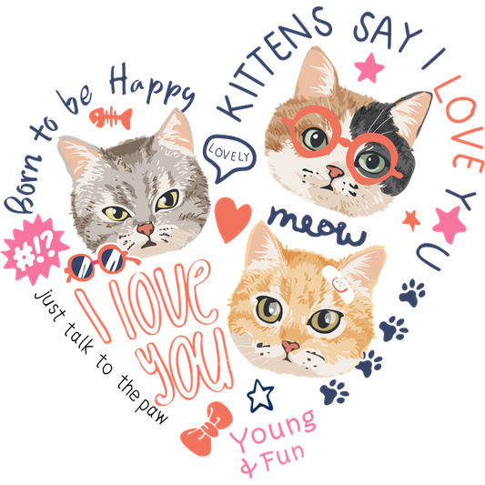 Regular price From £0.75 GBPRegular priceUnit price / per£2.39 GBPSale price From £0.75 GBPA charming illustration featuring three playful kittens with fun accessories, surrounded by colorful text declaring love and happiness. dtf transfers
