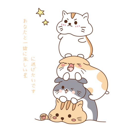 A cute illustration of four chubby cats stacked playfully on top of each other, radiating adorable energy.dtf regular iron