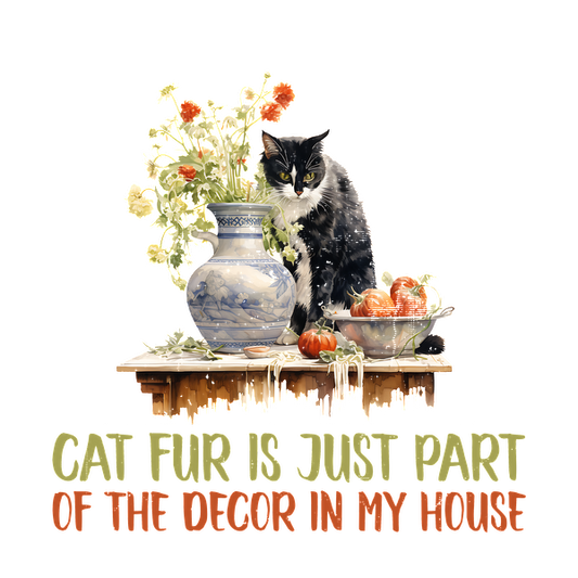 A charming black and white cat perched beside a vase of flowers and a bowl of fruit, capturing homey decor vibes. dtf transfers