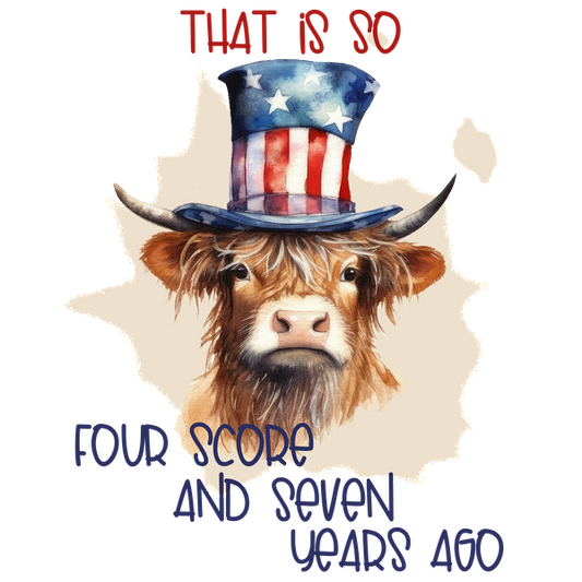 A whimsical illustration of a Highland cow wearing a patriotic top hat, accompanied by playful text referencing historical speeches. heat press transfers