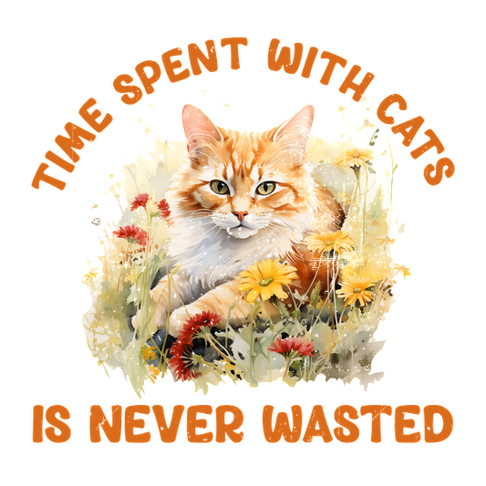 A charming illustration of an orange tabby cat surrounded by colorful flowers, with the quote about spending time with cats.dtf regular iron
