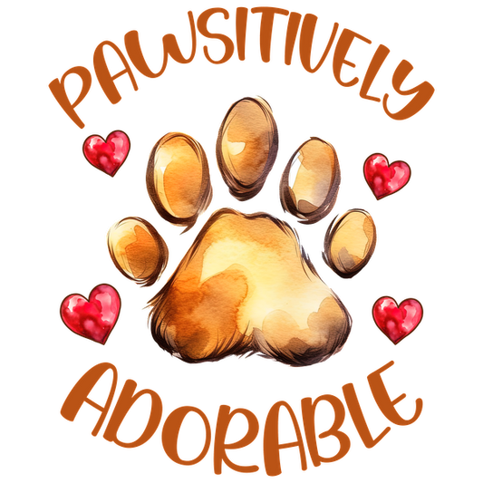 A charming design featuring a paw print surrounded by hearts, with the playful text "Pawsitively Adorable." heat press transfers