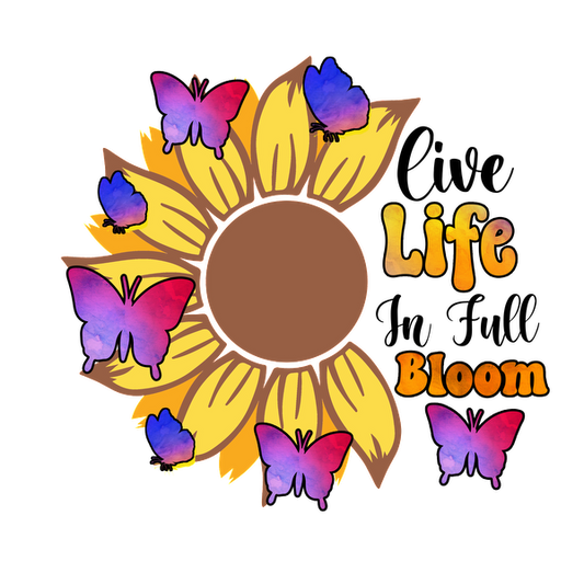 Regular price From £0.75 GBPRegular priceUnit price / per£2.39 GBPSale price From £0.75 GBPA vibrant sunflower adorned with colorful butterflies, featuring the uplifting text "Life Bloom" in playful fonts. dtf transfers