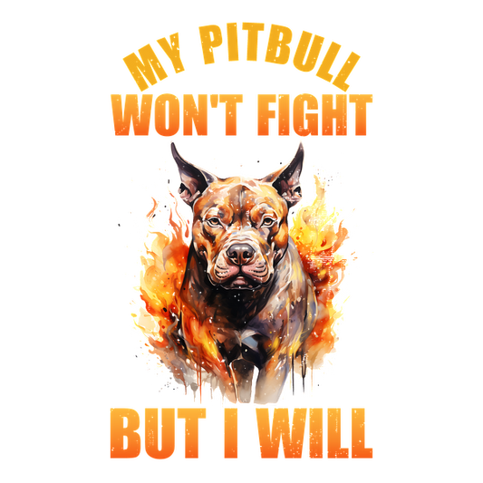 Regular price From £0.75 GBPRegular priceUnit price / per£2.39 GBPSale price From £0.75 GBPA bold graphic of a pitbull surrounded by flames, featuring the text "My Pitbull Won't Fight But I Will." heat press transfers