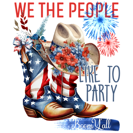 Celebrate in style with this festive graphic featuring cowboy boots, a floral hat, and bold patriotic colors!dtf regular iron