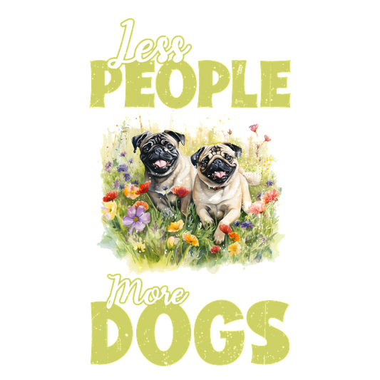 A charming design featuring two happy pugs surrounded by colorful flowers, with the slogan "Less People More Dogs." dtf prints