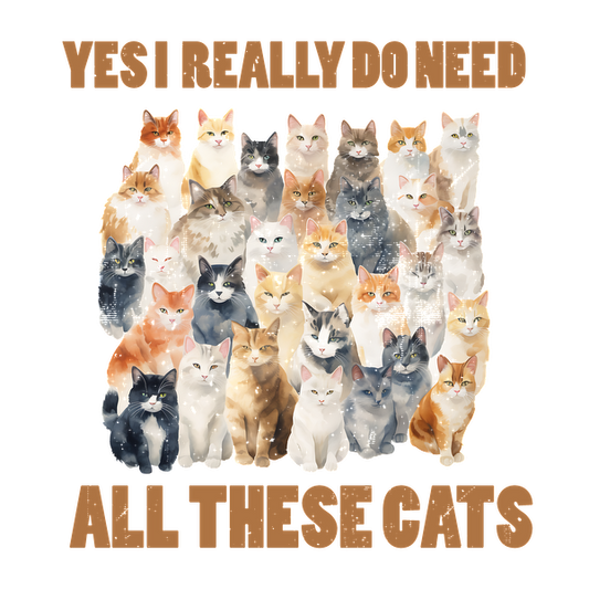 A whimsical illustration featuring numerous adorable cats with the playful text "YES I REALLY DO NEED ALL THESE CATS." heat press transfers