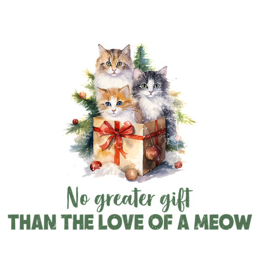 A charming holiday illustration featuring three playful kittens peeking from a gift box, surrounded by festive greenery and ornaments. heat press transfers